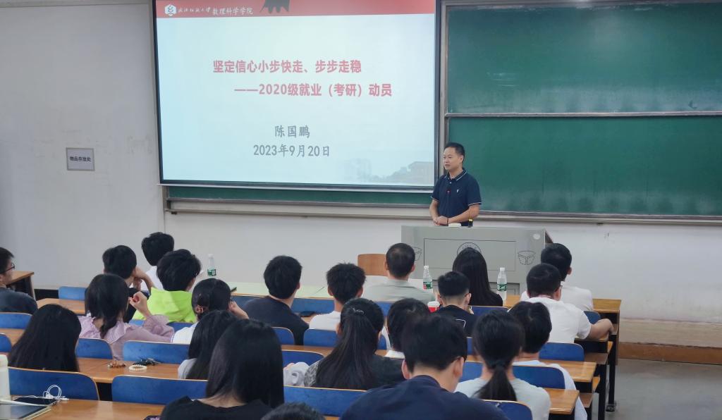 学院党委副书记陈国鹏以“坚定信心小步快走、步步走稳”为主题,向各位同学进行2020级的就业、考研动员,指出同学们目前对于未来的人生之路不够坚定、想法和行动缺乏一致性两个问题,并针对这些问题给出了自身意见。建议在座的各位同学,能够找准自己的专业导向,选择自身合适的发展。列举往年的学长学姐就业情况,帮助同学梳理未来可选择的发展思路。强调要提高自身综合素质,做好职业规划与认同、发扬团队精神、秉持纪律观念、加强沟通与学习能力。希望各位同学可以准确评估自己、准确对接行业,最终可以做到全面出击就业,进而未来可期。