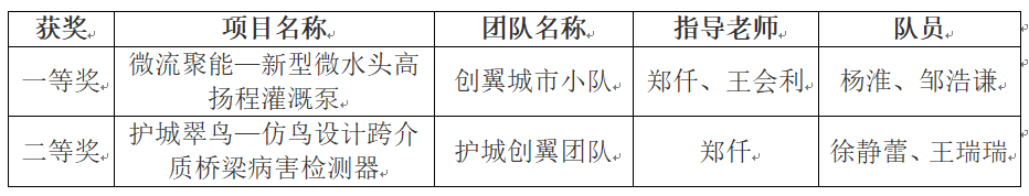 获得一等奖的创翼城市小队,其项目内容是:设计了一款无外源输入的新型微水头高扬程灌溉泵。装置较传统的轴向式泵水器效率提升了百分之十三,完成了绿色水流能的就地直接利用,实现了低流速高扬程泵水。