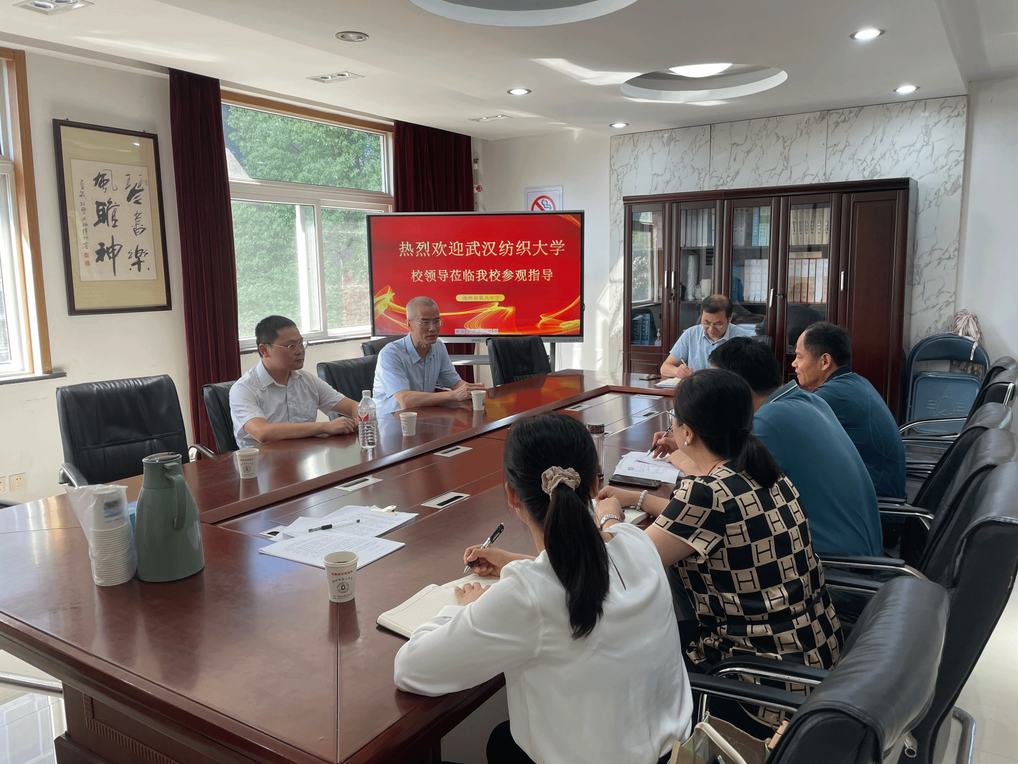 段溢波从有颜值、有内涵、有情怀、有温度、有梦想等5个方面介绍了学校的发展特色,介绍了学校近几年在安徽省的招生情况,池州市第八中学领导对我校取得的成绩表示赞赏。双方就比较关心的招生计划、录取政策、学生发展等问题进行了详尽交流。