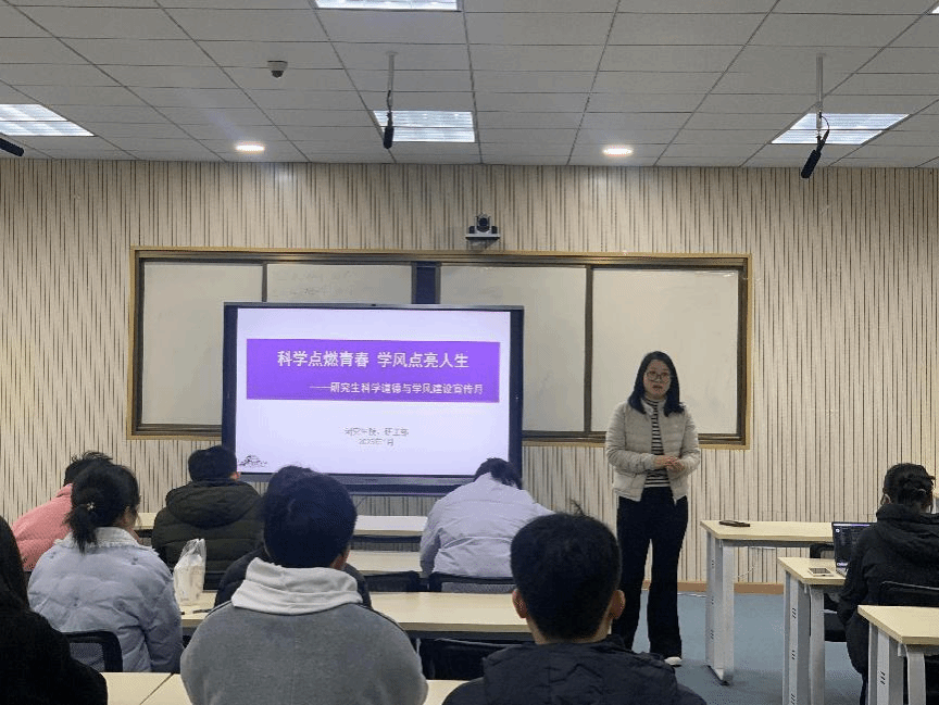遵守学术规范是科研创新和学术探索的基石,恪守学术道德是科研人员的基本准则和道德底线。为深入贯彻党的二十大精神,全面落实习近平总书记关于弘扬科学家精神和加强作风学风建设的重要指示,进一步强化学术规范和学术道德的宣传教育,加强研究生学风建设,积极营造求真务实、诚信严谨的学术氛围。9428cn太阳集团 微电子学院于2025年1月9日上午在04-205教室举行“科学点燃青春 学风点亮人生”主题教育班会。班会由学院副院长郑仟教授主讲,辅导员、德育导师、部分老师及全体研究生共同参加。