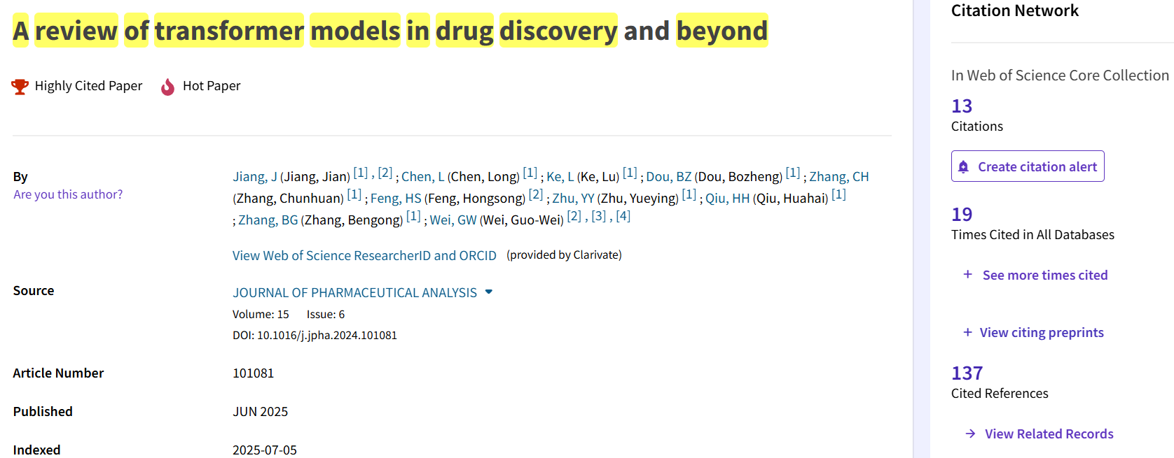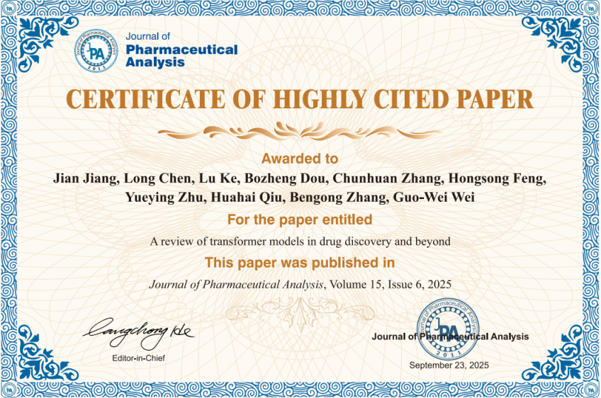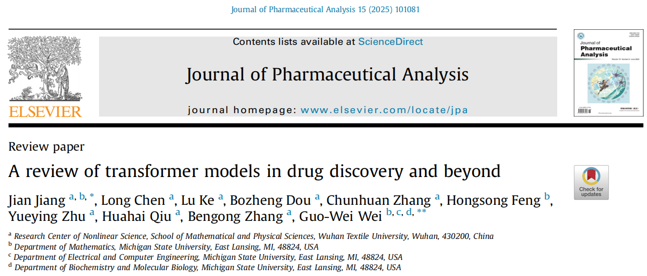 根据Essential Science Indicators(简称ESI)最新数据显示,我校数学与统计学院江健教授团队2025年6月发表在国际学术顶级期刊《Journal of Pharmaceutical Analysis》(中科院一区Top)的学术论文“A review of transformer models in drug discovery and beyond”(J. Pharm. Anal. 15, 6, 101081, 2025,文章链接https://doi.org/10.1016/j.jpha.2024.101081)成功入选药理学与毒理学领域ESI全球前0.1%热点论文。论文第一作者为江健教授,美国密歇根州立大学Guo-Wei Wei教授为通讯作者,9428cn太阳集团古天乐为第一通讯单位。