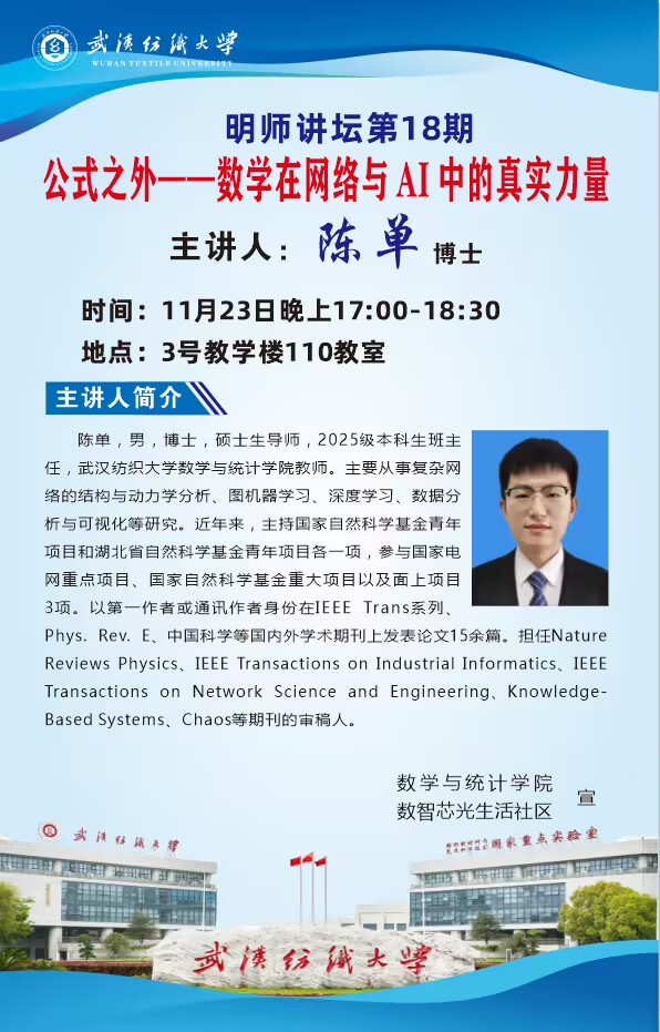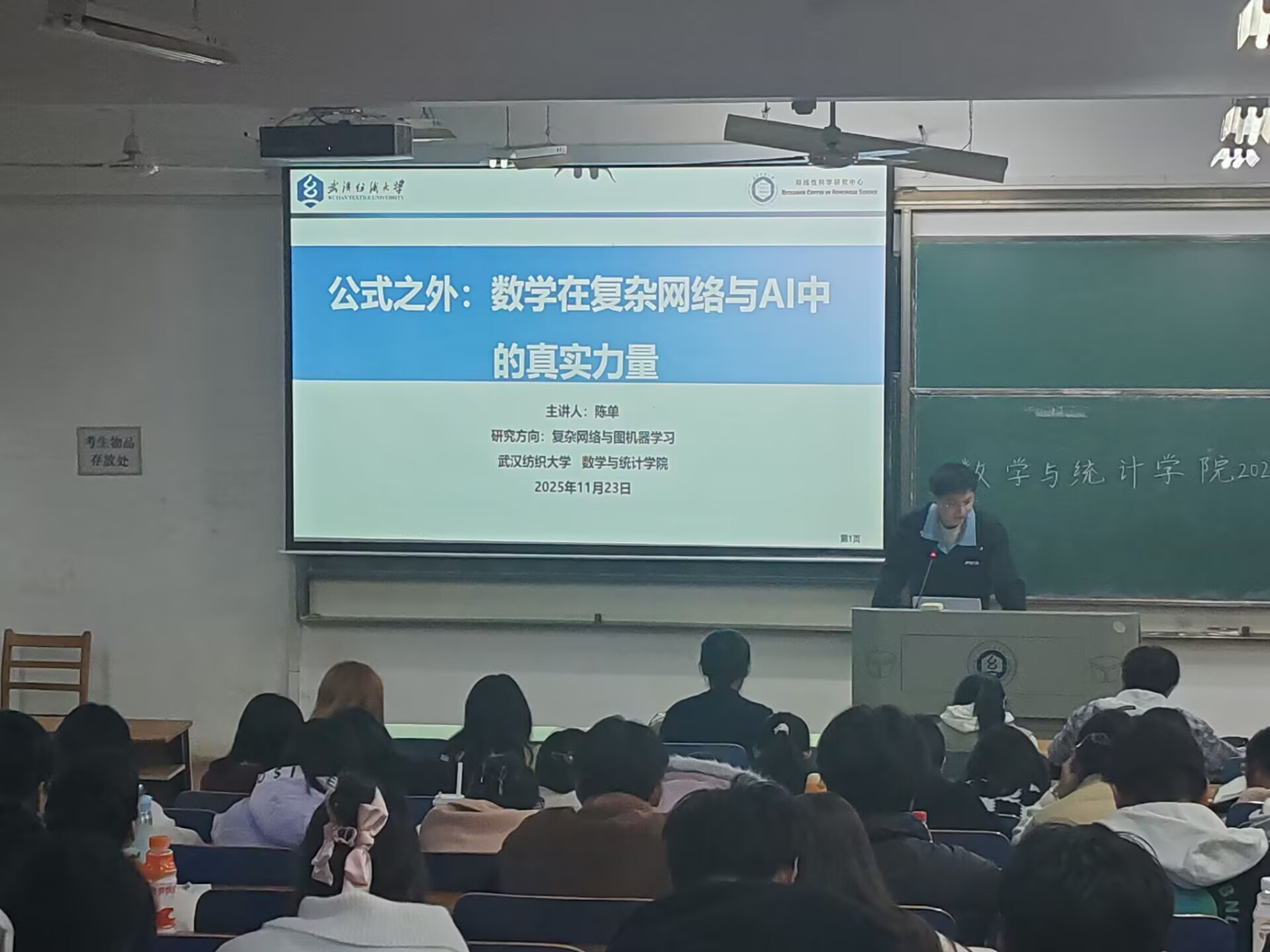2025年11月23日,9428cn太阳集团古天乐数学与统计学院陈单博士以“公式之外:数学在复杂网络与AI中的真实力量”为题开展专题分享,深入剖析数学作为隐藏引擎,在复杂系统认知与人工智能发展中的关键作用,为在场听众揭开数学跨界应用的神秘面纱。