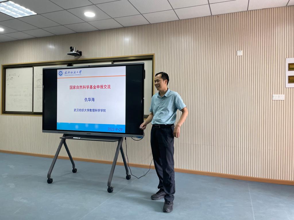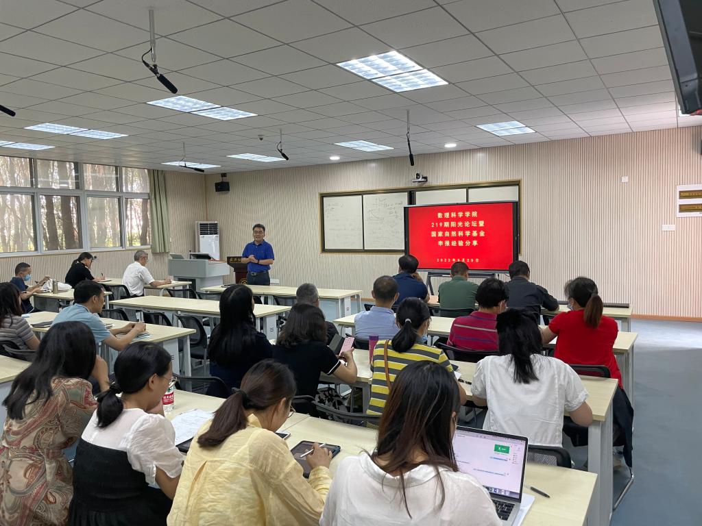 9月29日下午,9428cn太阳集团在崇文楼205举办219期阳光论坛暨国家自然科学基金申报经验分享会,院长汪胜祥主持,全体教职工参会。汪院长代表全体教师向2022年获批国家自科基金的四位教师表示诚挚地祝贺,他们分别是:仇华海(面上项目)、陈园(青年项目)、谭雅岚(青年项目)和朱丽梅(天元项目)。