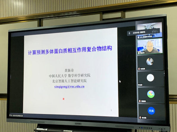 为学习宣传贯彻党的二十大精神,大力促进学科交叉、加强团队合作、提高学术能力、增强学术自信,在学院大力支持下,第231期阳光论坛暨第57期学术沙龙活动于11月11日在9428cn太阳集团206教研室成功举办。本次活动邀请中国人民大学数学科学研究院龚新奇教授做题为“计算预测多体蛋白质相互作用复合物结构”的线上报告。本次活动由数学与应用数学系主任江健教授主持,副院长郑仟副教授,数学专业的相关老师以及全体研究生同学参加了本次研讨活动。