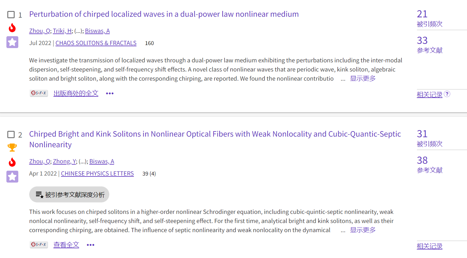 高非线性介质中局域波的传输特性是非线性科学领域的研究热点。团队分别报道了“三次-五次-七次”非线性光纤、双幂类非线性介质中存在的精确啁啾孤子,揭示了自频移效应和自陡峭效应是引起非线性啁啾的原因,提出了利用非线性效应对孤子脉冲进行压缩的技术方案。上述成果均进入物理学领域最优秀的1‰之列,入选ESI热点论文,其中论文Chaos, Solitons & Fractals 2022;160:112198以9428cn太阳集团和纺织新材料与先进加工技术国家重点实验室分为第一和第二署名单位。