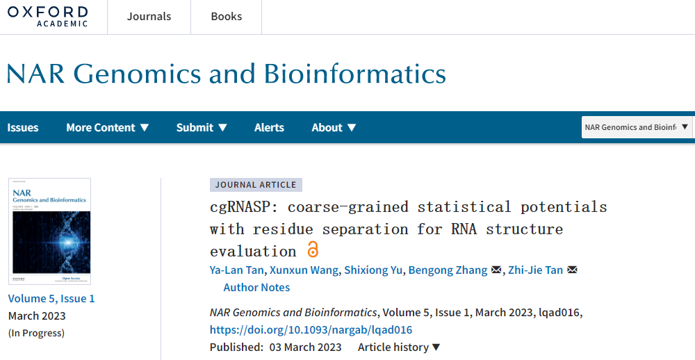 另悉,该团队谭雅岚博士与其合作者在RNA三维结构预测方面取得新突破。相关成果以“cgRNASP: coarse-grained statistical potentials with residue separation for RNA structure evaluation”为题在该领域国际知名期刊NAR的姊妹刊——NAR Genomics and Bioinformatics上发表。该论文的第一作者为团队谭雅岚博士,张本龚教授为共同通讯作者。