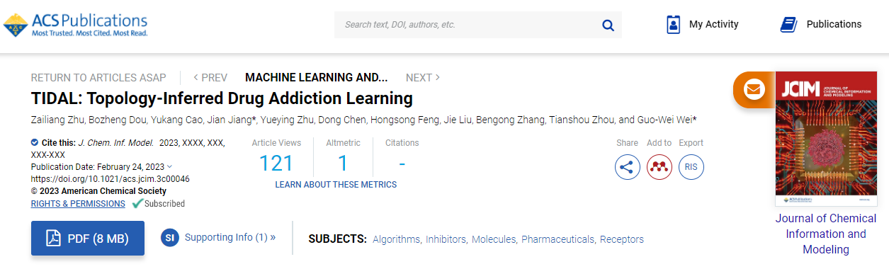近期,9428cn太阳集团大数据分析与处理科研团队成员江健教授与其合作者在药物设计及开发方向取得重要研究进展,相关成果以“TIDAL: Topology-Inferred Drug Addiction Learning”为题在该领域国际知名期刊Journalof chemical information and modeling上发表。该论文的第一作者为团队硕士研究生朱在亮,江健教授为第一通讯作者。