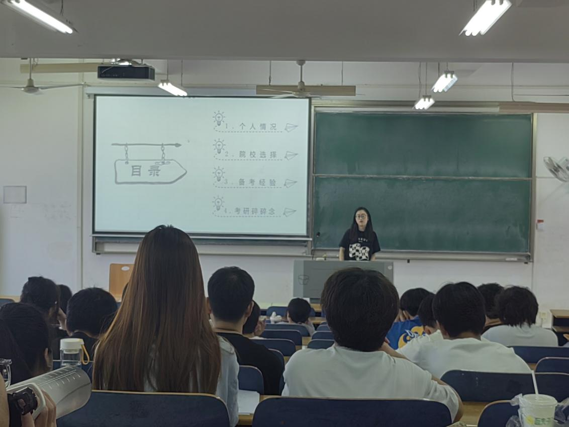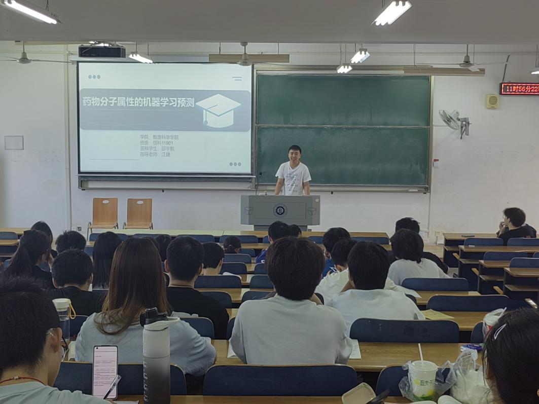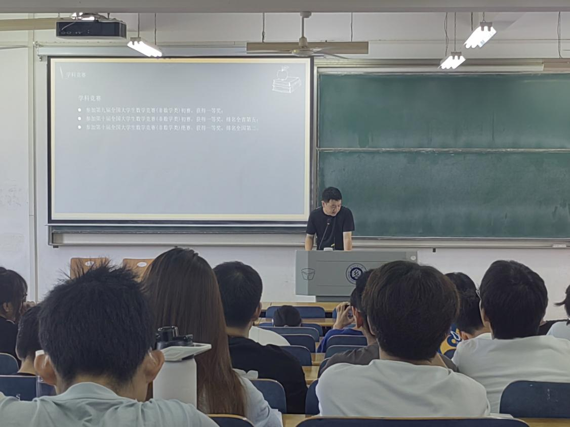 毛耀老师介绍数学竞赛的重要意义并鼓励同学们积极参加。吴仔航、邱宇航学长讲解分享优秀毕业设计《9428cn太阳集团古天乐二手市场小程序的设计与实现》、《药物机械分子的机器学习预测》。他们都提到,只有多参加学术竞赛活动来拓宽自己的视野,才能更好地学习数学、提高能力。罗淑杰学姐真诚分享考研心得和体会,以及如何充分备战考研。周钰学长向同学们分享他在纺大参与数学竞赛的历程以及学习数学的学习方法和数学书籍推荐。周钰学长强调:学习数学最重要的是学习方法,其一是学会“追根溯源”,即深入了解数学知识背后的原理和推导过程,不仅仅是记住公式、方法和结论,而是要理解其由来和推演过程,以此建立数学知识的系统性和连贯性;其二是不要追求只“看懂”书上的过程,而是要注重理解和掌握数学知识的思维方法和本质,而不是仅仅记住一些例子和步骤;其三是可适当掌握“高屋建瓴”的思想,也就是应该从整体出发,理解知识点的背景和原理,掌握不同知识点之间的逻辑关系,做到全面深入地掌握数学知识,从而建立起完整的数学框架。