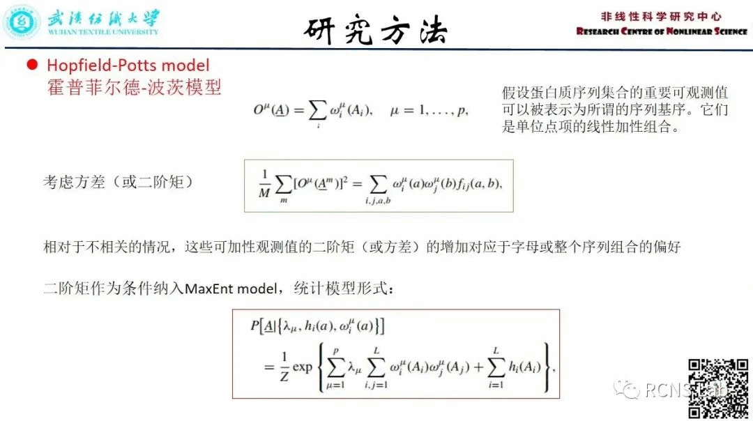 郭成:本次汇报一篇文献《Selection of sequence motifs and generative Hopfield-Potts models for protein families》进化相关蛋白质家族的统计模型最近引起了人们的兴趣,特别是,通过直接耦合分析(DCA)推断的成对Potts模型能够提取折叠蛋白质的三维结构和蛋白质中氨基酸取代的信息。在此,本文提出了一种基于选择集体序列基序(motifs)的参数约简方法。它自然地导致了根据霍普菲尔德-波茨(Hopfield-Potts)模型建立的统计序列模型的形成。这些模型可以精确地推断使用映射到限制玻尔兹曼机器(RBM)和持久的对比散度(PCD)。本文表明,当应用于蛋白质数据时,即使是20-40个模式也足以获得统计上接近生成的模型。Hopfield模式形成可解释的序列基序,并可用于将氨基酸序列聚类为功能亚家族。
