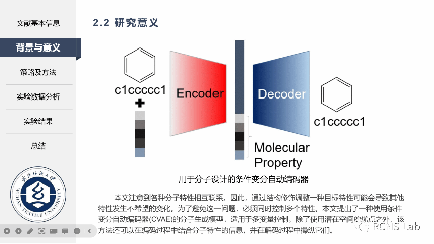 王永康:本次组会汇报了一篇文献《Molecular generative model based on conditional variational autoencoder for de novo molecular design》。其中使用ZINC开源数据库中的50万个分子数据,在SMILES 代码末尾填充了一个“E”以指示字符串的结尾,同时将本实验设置的五个目标属性来构成条件向量,并通过编码器中RNN生成和组合潜在空间向量和条件向量,然后在解码器中使用softmax层来优化CVAE函数。解码器单元的每个输出向量表示 SMILES 代码字符和“E”的概率分布。最后,输出向量被转换为 SMILES 代码。本文提出了一种基于条件变分自动编码器的新型分子设计策略。作为深度学习生成模型之一,该方法的优势在于能够通过将多个目标属性应用于条件向量上来同时控制它们。此外,我们可以在不改变其他属性的情况下,有选择地调控某一目标特性的数值,并且拓展了对特定属性的训练集范围。