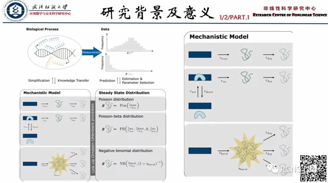张秋玉:本次汇报了一篇文献《A mechanistic model for the negative binomial distribution of single-cell mRNA counts》。在分析单细胞RNA测序实验的结果时,通常需要假设观察到的测序计数的概率分布。哪种是最合适的离散分布是一个悬而未决的问题。为了解决可解释性的问题,研究了常用的离散概率分布下的机制转录和降解模型:从已知的转录降解模型推断稳态概率分布,如Poisson分布或Poisson-beta分布。把这个过程颠倒,我们展示了如何从给定的概率分布推断出相应的生物模型,这里是负二项分布。到目前为止,支持这一分布假设的机制模型尚不清楚。文章的结果表明,负二项分布是以稳态分布的形式出现的,它来自于一个爆发产生mRNA分子的动力学模型。我们的经验表明,它在计算复杂性和生物简单性之间提供了一种方便的权衡。