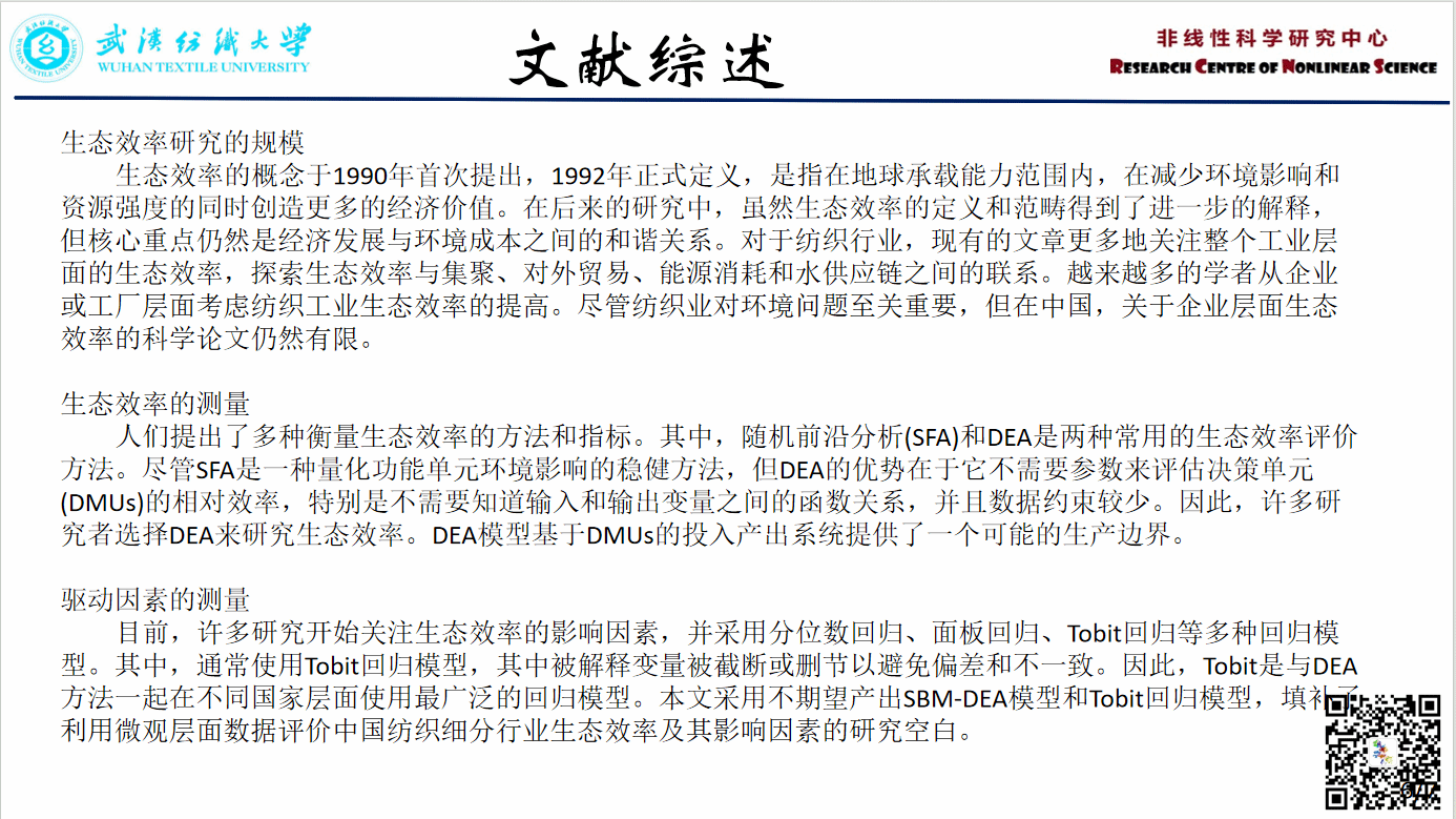 黄加阳:本次汇报了一篇《基于企业层面分析的中国纺织工业生态效率研究》。工业生态效率一直是衡量生产活动与环境耗竭之间关系的宝贵指标,在实现可持续发展的目标时,对这一点进行调查是很重要的。然而,对于纺织行业,从企业层面对其生态效率进行全面评价的严谨研究有限,对子行业多层次比较的研究也较为缺乏。鉴于纺织行业中各种原材料的选择和不标准化的生产过程对环境影响的差异,我们重点研究了三个子行业,即棉花、化学纤维纺织行业(CCTS)、非棉纺织行业(NCTS)和印染行业(PDS)。采用基于数据包络分析(DEA)的懒汉测度(SBM)模型,即SBM-DEA模型,利用大样本数据集,在企业层面对2001 - 2011年中国纺织工业的生态效率进行了测度。利用Tobit回归模型进一步分析了影响生态效率的因素。