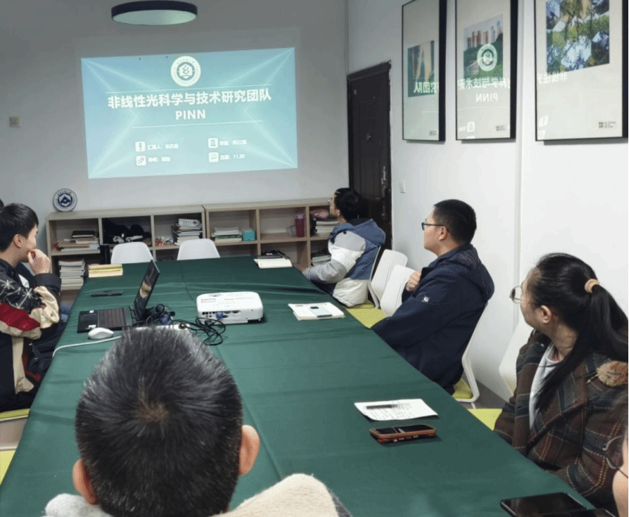 周勤教师团队研究生陈伟介绍了可饱和吸收体,并展开讲述了真实的可饱和吸收体和等效可饱和吸收体的异同。李楠和徐苏勇向我们介绍了非线性光科学与技术中常用的双线性法以及非线性光科学里面的PINN。他们通过现身说法,为同学们开展科学研究、提升学术素养提供了可资借鉴的具体途径与方法。