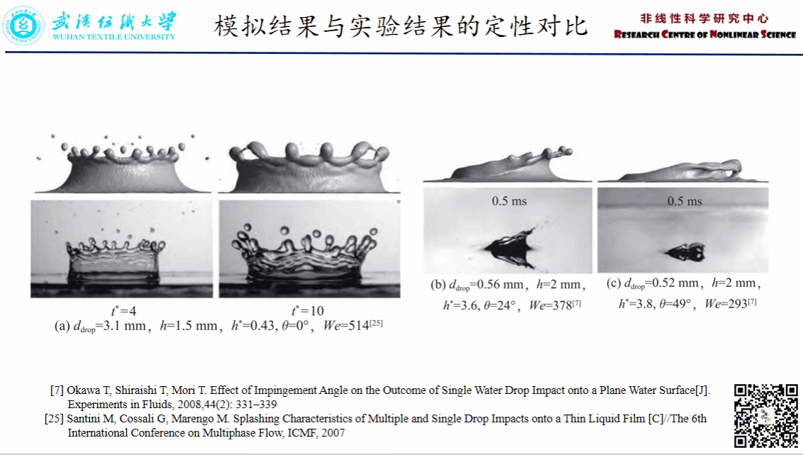 周锐:双液滴连续倾斜撞击液膜界面演变特性的研究,本研究采用 CLSVOF 方法对双液滴连续撞击薄液膜的过程进行了三维数值模拟。分析了撞击过程中界面演变的多种特征,双液滴撞击薄液膜过程中产生的一次水花为单侧飞溅,二次水花为全方位飞溅,薄液膜更容易产生全方位飞溅。在正视图中,弹坑轮廓存在“类扇形–类四边形–局部失稳–类梯形”的演变过程;在侧视图上,轮廓有“半椭圆形–类碗形–类矩形–局部失稳–类梯形”的演变过程。双液滴倾斜撞击弹坑演变经历了扩展期、变形期和二次扩展期三个时期,弹坑的径向扩展取决于流动阻力和径向动能。
