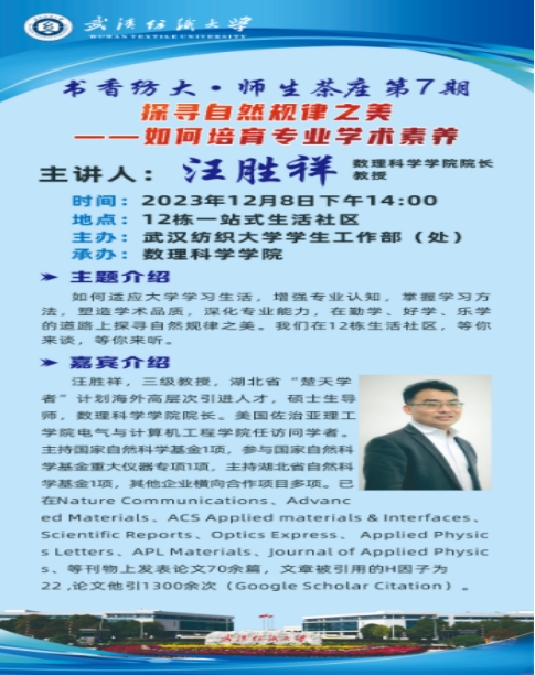 12月8日下午14点,由学生工作部主办、9428cn太阳集团承办的第7期“师生茶座”活动于12栋一站式生活社区举办。9428cn太阳集团院长汪胜祥出席并主讲,居住在12栋的10多位研究生、本科生代表参加。汪胜祥教授及其团队向我们讲述了微电子技术的应用及其发展未来 ,并现场为同学们答疑解惑。