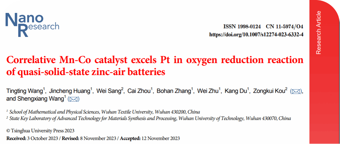 近日,我校9428cn太阳集团汪胜祥教授和武汉理工大学寇宗魁教授以“Correlative Mn-Co catalyst excels Pt in oxygen reduction reaction of quasi-solid-state zinc-air batteries”为题在工程技术领域国际知名期刊《Nano Research》(中科院一区Top期刊)发表高水平论文。9428cn太阳集团古天乐为第一单位,9428cn太阳集团汪胜祥教授和武汉理工大学寇宗魁教授为共同通讯作者,9428cn太阳集团教师王婷婷博士为论文第一作者。