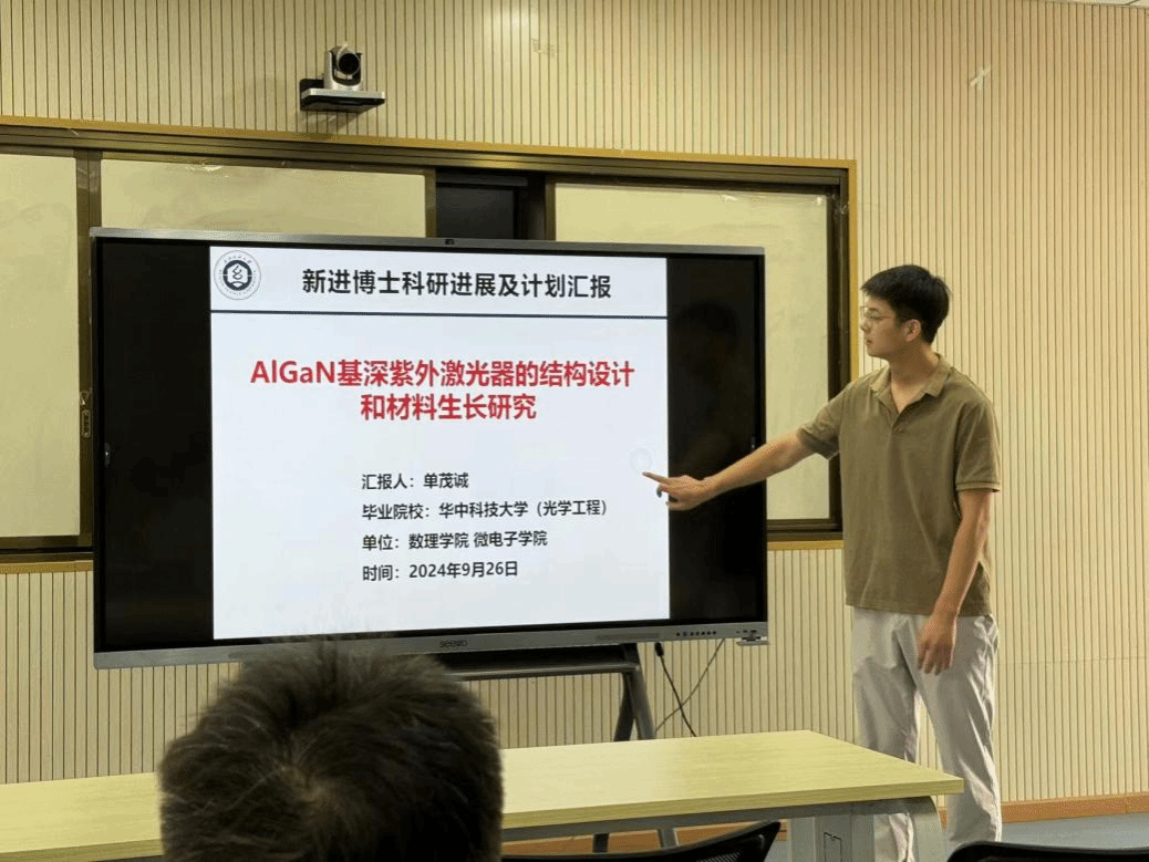 单茂诚博士的报告题目为”AlGaN基深紫外激光器的结构设计和材料生长研究“。报告介绍了基于第三代半导体AlGaN材料的深紫外激光器的研究进展情况,针对高增益有源区的结构设计,创新提出原子层级超薄GaN量子阱的能带调控和外延控制技术,深入探讨了界面质量和载流子动力学过程的内在联系。同时,对电化学选择性刻蚀结合化学刻蚀方法制备高反射DBR构件,并进行量子结构的原位重建进行了有益探索,相关研究成果对进一步实现电注入型深紫外激光器打下重要基础。