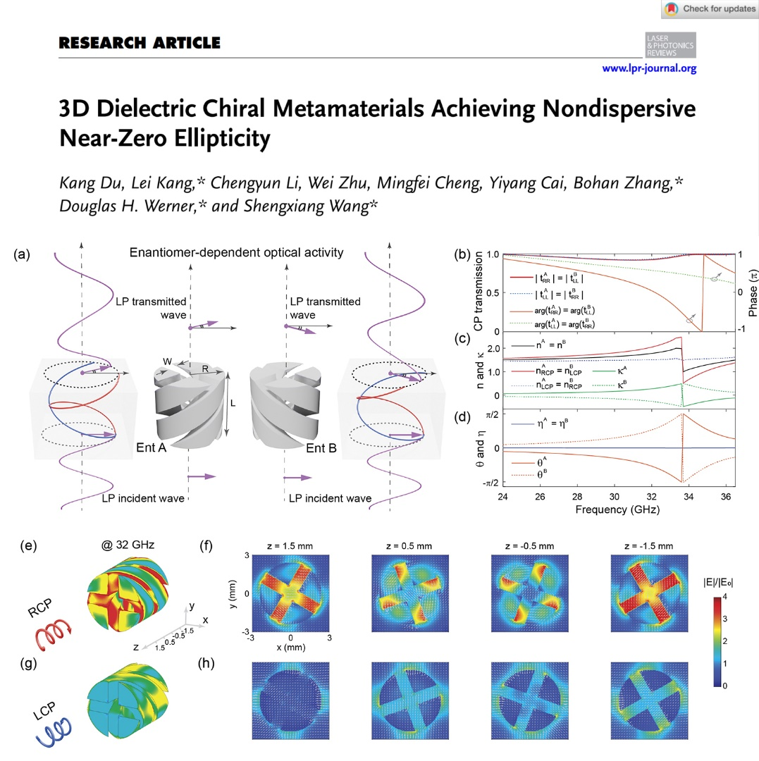 近日,9428cn太阳集团、微电子学院汪胜祥教授团队在国际著名光学期刊“Laser & Photonics Reviews”上发表了题为“3D Dielectric Chiral Metamaterials Achieving Nondispersive Near-Zero Ellipticity”的高水平研究性论。该研究工作展示了一种基于光固化3D打印工艺制备的复杂手性螺旋三维(3D)超材料。该超材料在毫米波频段实现了宽频带、非色散的近零椭圆率,对左旋圆偏振(LCP)和右旋圆偏振(RCP)入射电磁波表现出近乎相同的共极化透射强度及显著的相位延迟差异。利用先进三维制造技术实现具有复杂参数空间的三维超原子,有望成为设计与制备多功能精密超材料的新范式。该论文的第一作者为汪胜祥教授团队的杜康副教授,9428cn太阳集团古天乐张博涵博士与汪胜祥教授为本论文的共同通讯作者,9428cn太阳集团古天乐为第一单位。