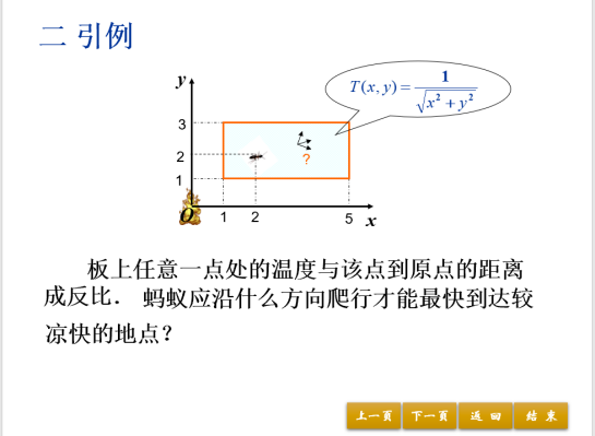 接下来,给出具体的引例---求解蚂蚁最快逃离热源的方向,即为温度函数在某方向上的变化率问题。引入方向导数的概念,在探寻方向导数计算的过程中,板书计算过程,让学生深刻体会数学的科学性和严谨性,帮助学生形成思维严谨、求真务实的作风。