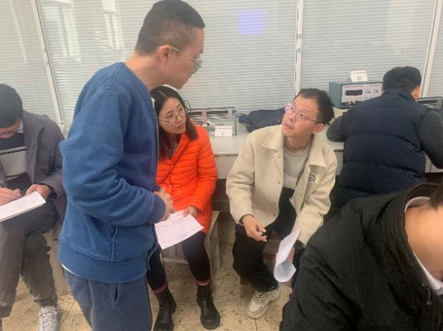 大学物理实验教学示范中心汪枫老师以《超声波声速测量》一课向各位观摩的老师展示了如何“寓理于事”。他带领同学们横贯古今,思接千载,从三分损益法到奋斗者号探万米深海,感受中国传统文化和现代科学的魅力,在文化思想和科学思维的交融中,以问题为驱动,深入探究超声波传播速度的测量原理和实验方法,帮助同学们塑造联系性的思维意识,能够正确辨识知识点背后的客观规律。通过叙事的方式融合知识点来启发学生进行思考和互动,加上幽默的互动语言提升课堂参与度,双向奔赴的“教”与“学”课堂氛围受到了老师们的好评。课后交流期间,教师们纷纷针对本堂课教学的亮点进行求教,对可以丰富和改善的地方也贡献自己的简介,尤其是部分资深教师与汪老师的探讨与互动中,让每位新教师都收益匪浅。