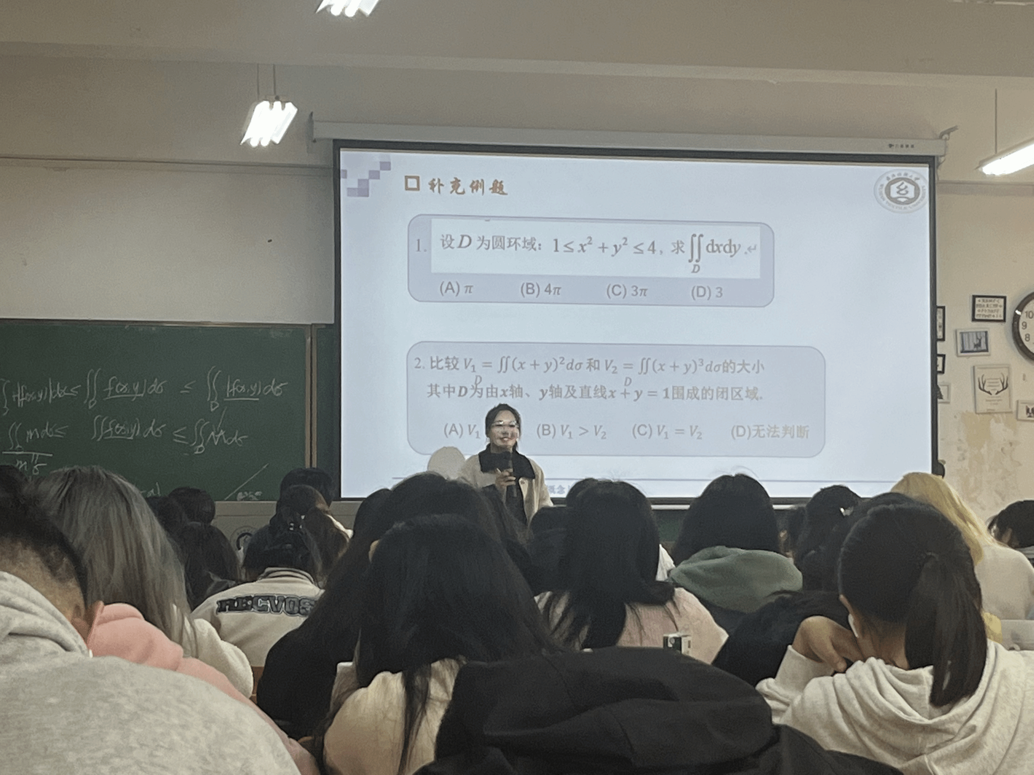 郭秀娅老师所教授的微积分(下)课程--《双重积分法的概念及性质》充满了生动与活力。她以问题驱动的教学方法导入新课,并采用动画演示的多媒体课件与板书相结合的方式,图文并茂地讲解定积分与二重积分的区别于联系,让学生在已有知识的基础上,加深对新知识的理解与记忆。随后,再通过课外例题的补充,让学生学以致用,举一反三,课堂氛围较好。