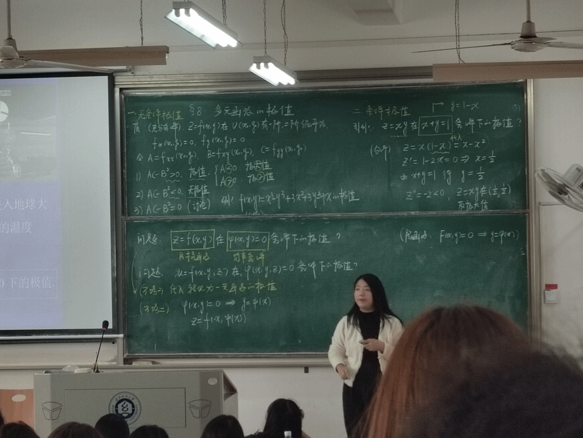 罗娟老师所教授的高等数学A(II)课程《多元函数的极值》充满了生动与活力,她运用图文并茂、辅助动画演示的多媒体课件,并结合黑板板书,声情并茂讲解了无条件极值和条件极值问题的求解方法。整个观摩课,师生互动积极,课堂气氛活跃,授课极富感染力,充分调动了学生的主动性,极大激发了学生的学习兴趣。