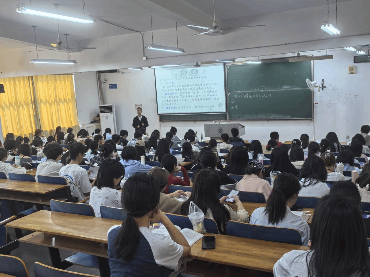 史文杰老师授课内容为《线性代数》的“向量组的线性相关性”。在课程伊始,史老师巧妙地从日常生活场景入手,以电影院座位编号与观众位置的对应关系为例,生动形象地解释了 “相关” 与 “无关” 的概念,自然流畅地引入向量组的线性相关和线性无关的定义。这一独特的引入方式,瞬间激发了学生的学习兴趣,让原本抽象的数学概念变得通俗易懂,为后续的深入学习奠定了良好基础。为帮助学生巩固对定义的理解,史老师精心挑选了多个具体算例。在讲解过程中,教师一步步引导学生分析问题,详细展示解题步骤,注重培养学生的逻辑思维和运算能力。通过这些算例,学生们不仅掌握了判断向量组线性相关性的方法,还学会了如何运用所学知识解决实际问题,课堂上学生们积极思考,认真演算,学习氛围浓厚。