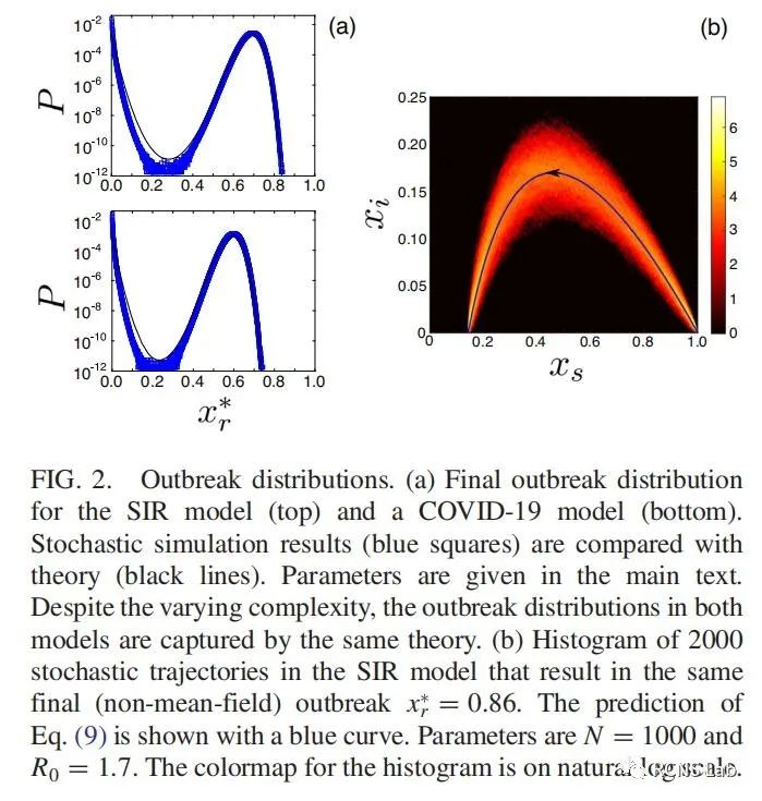 许朝瑞:分享了一篇名为《Outbreak Size Distribution in Stochastic Epidemic Models》的文章。在新冠疫情不定期爆发的背景下,该文章利用带有人群统计噪声的SIR及其扩展的流行病学模型,解决了计算大范围爆发的动力学和可能性的典型问题。在大量的人口限制下,本文计算了所有广泛爆发的概率分布,包括那些需要异常(极端)大、小人口比例的流行病爆发案例。该研究表明,与其他随机系统中的疫情爆发不同。极端爆发的统计数据来自于一个完整的连续哈密顿路径,每个路径都满足独特的边界条件,具有守恒的概率通量。